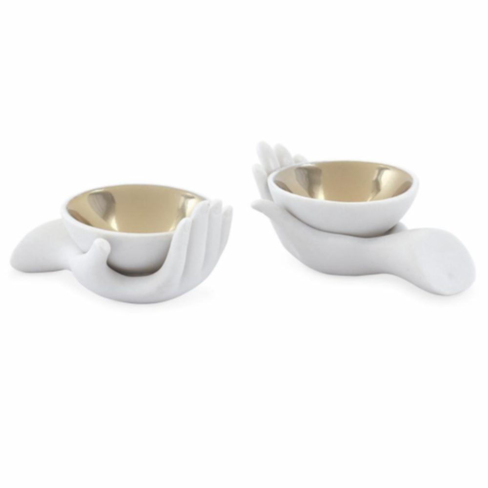 Skålene er i hvit, matt porselen med gullinteriør.