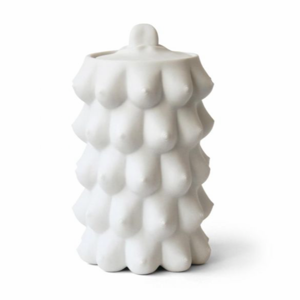 Hvit krukke med lokk. Man kan også ta av lokket og bruke den som en vase.