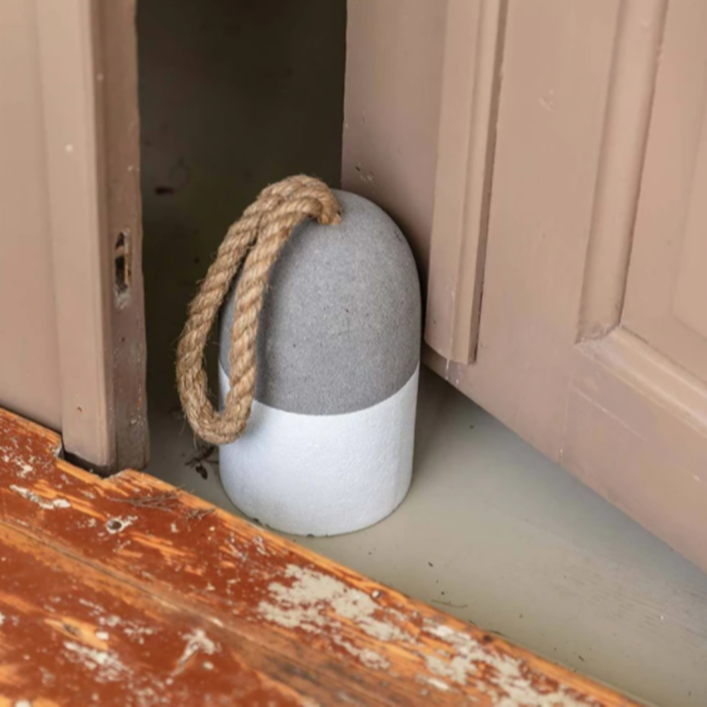 Dørstopperen har en solid vekt, men tauet gjør at den likevel er enkel å flytte rundt.