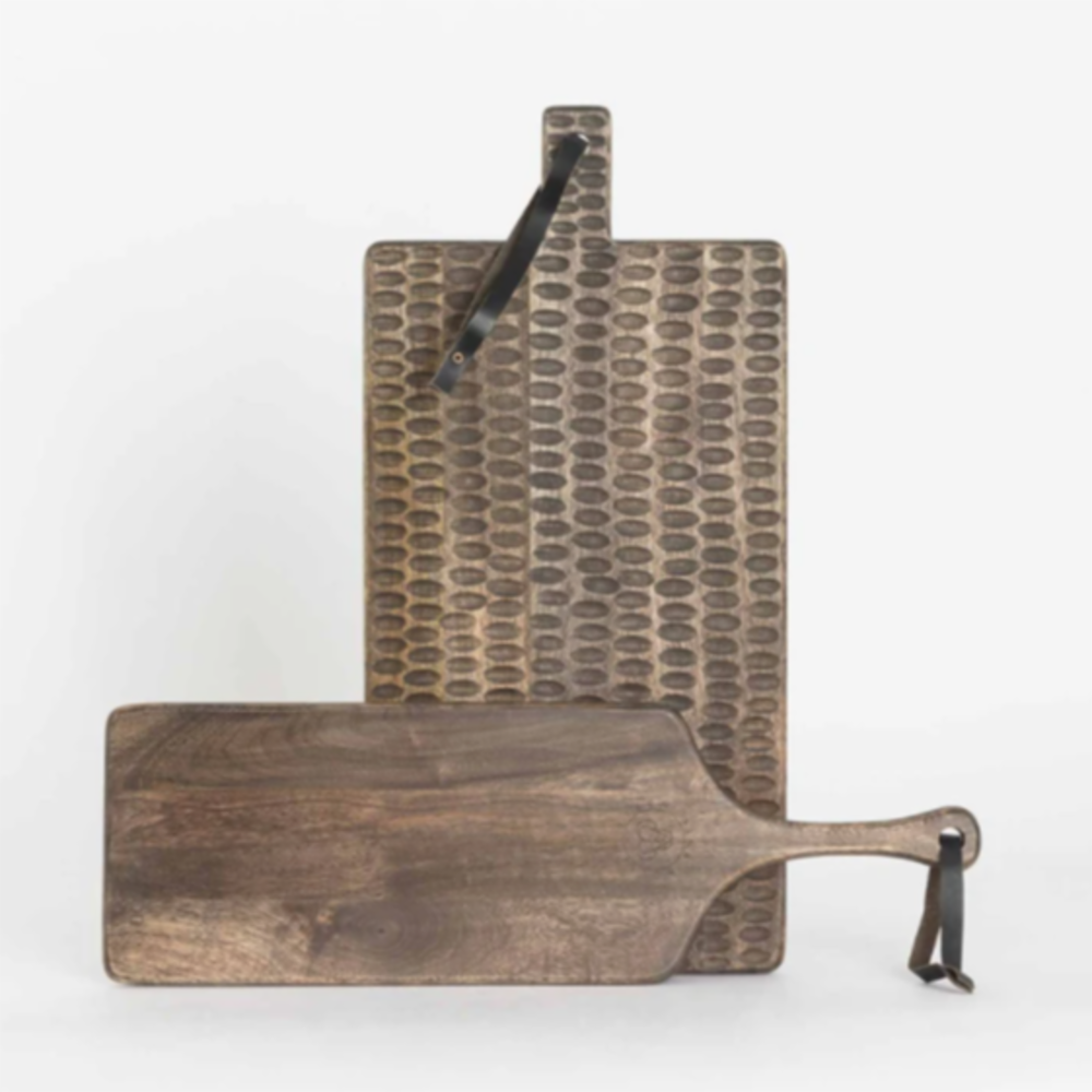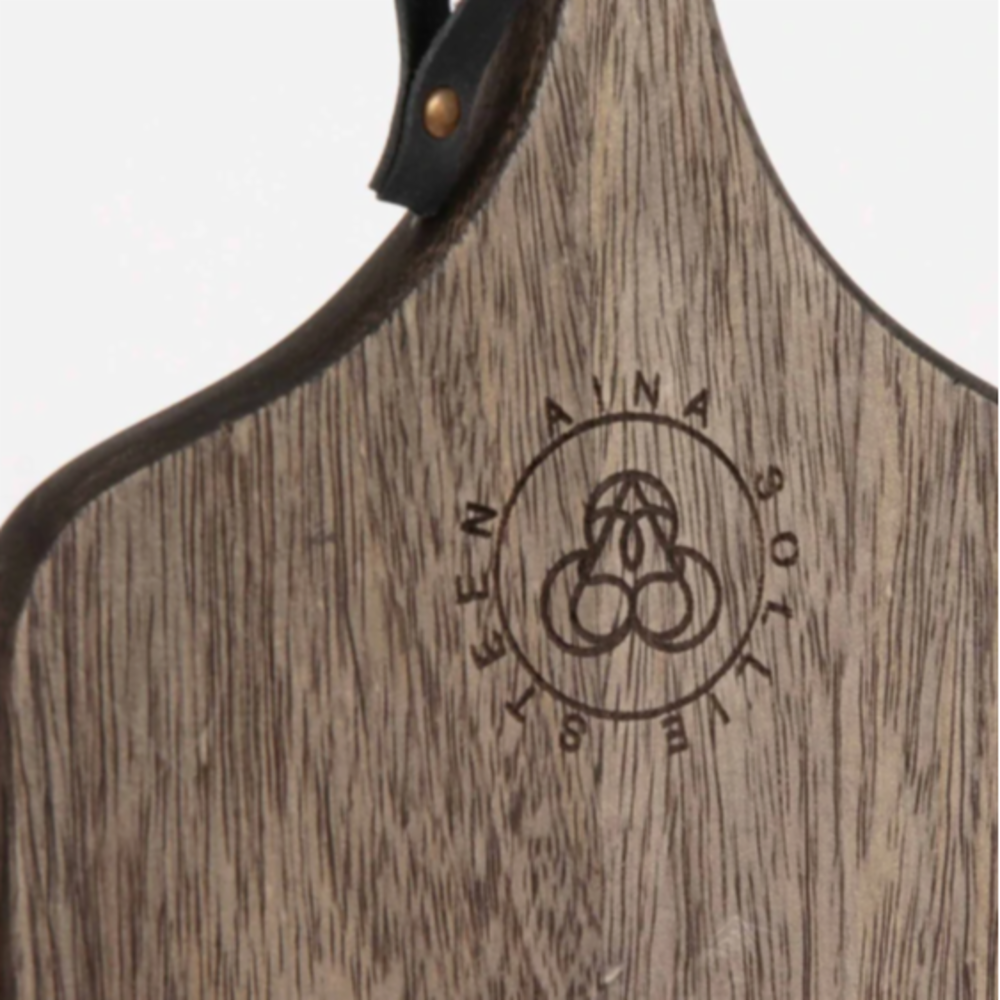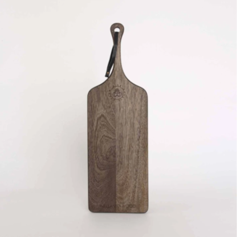 Trefjøl med mørkbeiset overflate og skinnreim i håndtaket. Selges i en større størrelse også. Begge størrelsene har logo på en side.